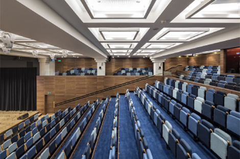 名門のUniversity of Warwickに新設された校舎内の、風通しの良い2つのレクチャーシアター。劇場イス仕様の特注のシートを納入しました。