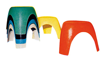 日本初の万博を象徴するシンボル、岡本太郎氏の「太陽の塔」。FRP製品の製作で培った技術と信頼で、太陽の顔部分の製作を依頼されることになりました。「太陽の顔」は発泡スチロールで原型を作り、岡本太郎氏が修正後、大きなままでは輸送できないため、原型を数個に切断。原型から型を作り、ハンドレイアップで製作したものを現地で組立てて取付けるという、大変大掛かりな作業でした。他にも、様々な広場や各パビリオンに次々とFRPイスが設置されていきます。また、日本で初めて、屋外ベンチをデザインすることになり、ストリートファニチュアの大ロングセラーとなる剣持勇デザイン研究所の松本所長による、通称「万博ベンチ」が誕生します。FRPの小さなユニットをスノコ状に並べてベンチを形成し、直形状、R形状に対応できる斬新で美しく機能的なベンチは、これまでにないものとして評判を呼びました。このベンチが、現代の屋外家具「ストリートファニチュア」の原点と言えるでしょう。