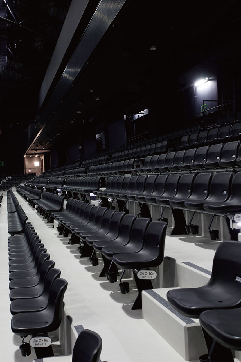 The facility boasts a total seating capacity of 4,002 (1st floor: movable seating for 1,232, 2nd floor: standard seating for 2,393, 3rd floor: standard seating for 273, VIP seating for 104). All the seats have been provided by Kotobuki Seating.The photograph shows the scene at the bj-league (Basketball Japan League) Sendai 89ERS home season opener. Spectator seating consists of 1st floor (moveable/wall storage removable seating), 2nd floor standard seating (fixed) and 3rd floor VIP seating (fixed seating). The blue ribbon LED on the 3rd floor seating is the basic color of the Xebio Arena Sendai, while yellow is the team color of the Sendai 89ERS.