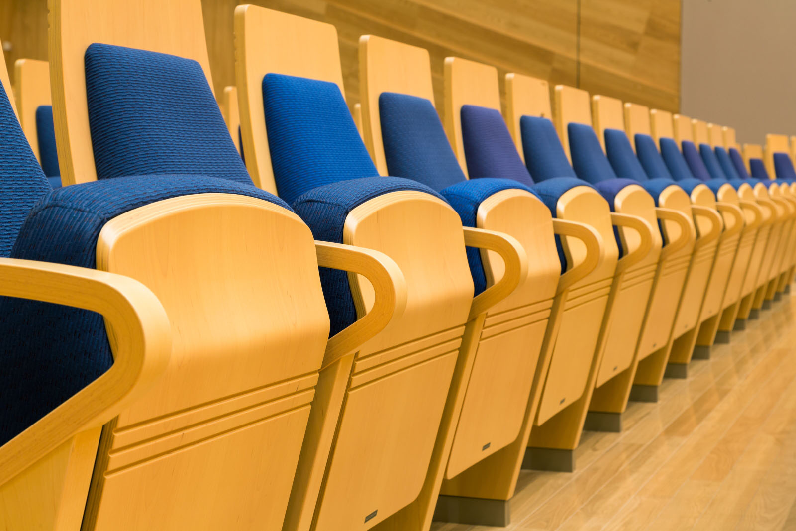 The bentwood armrests are featured on the 1,292 chairs designed by Fumihiko Maki and delivered by Kotobuki Seating. It also emphasizes the presence of each seat with its unique backrest shape that slopes upward from the lower back portion. As a result of this subtle design, the space feels more cohesive while also giving the impression of an individual seat. The three slits on the back of the backrest and the seat accentuate the spacious hall space.