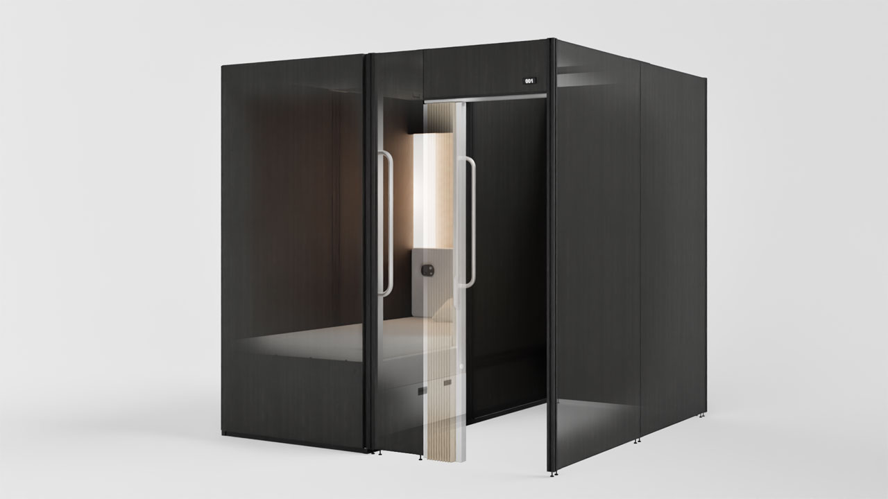 本体には堅牢なパネル式構造を採用。出入口を二重カーテンで区切ることで、外から見えなくするのはもちろん、遮音性も高めました。さらにベッド手前にプライベートスペースを設置し、共有スペースとの距離感も確保。プライベートが守られた自分だけの静かな空間で、安心して休める設計です。