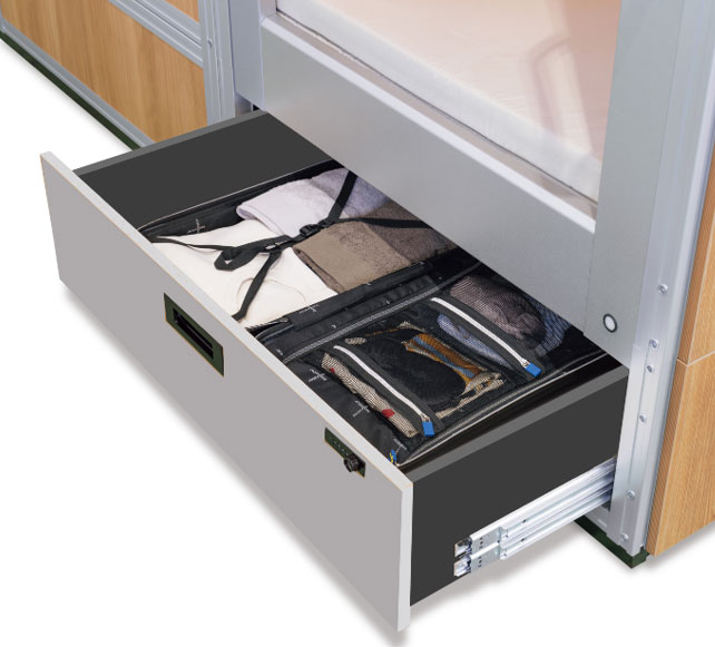 お手元に荷物を置いておけるよう、収納機能も充実。ベッド下の引出しにスーツケース
