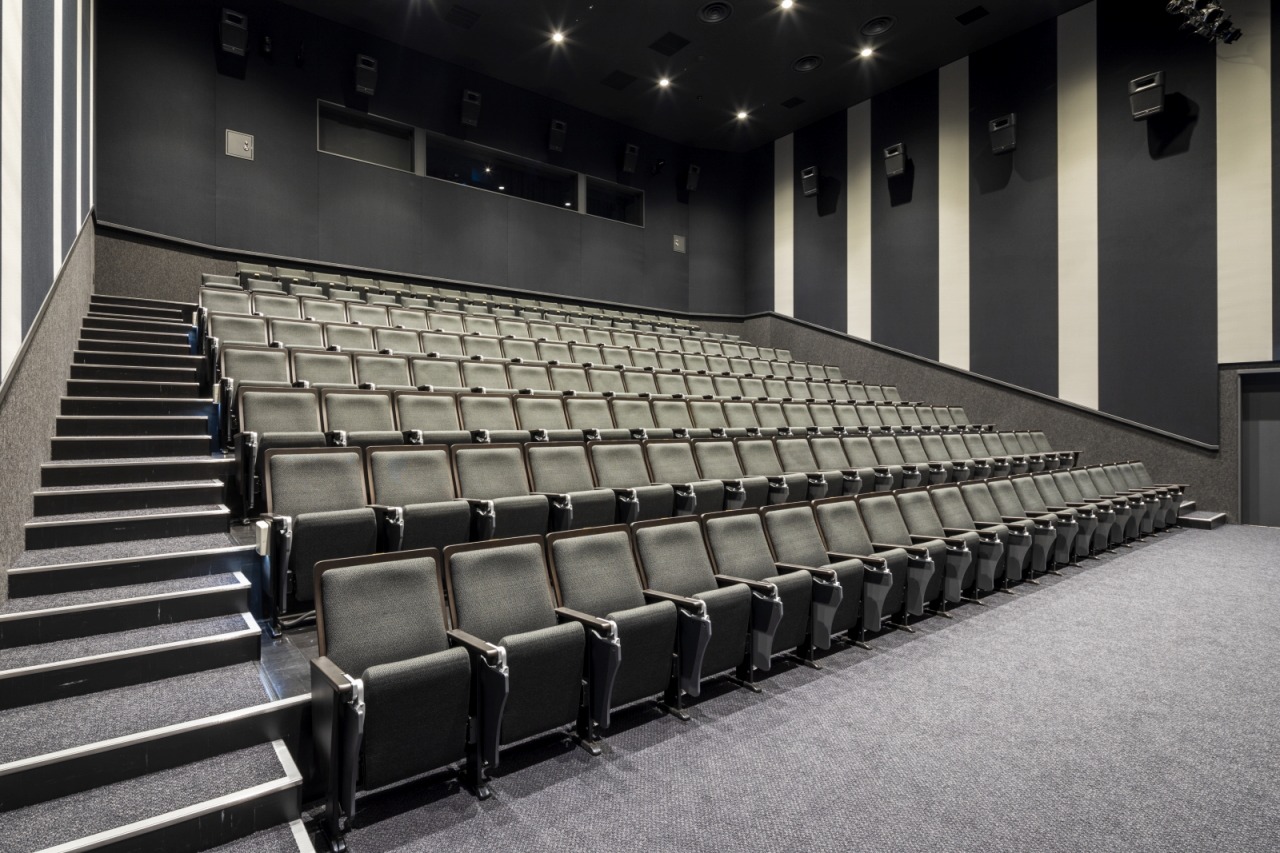 今回納入したイスは、固定イスとスタッキングチェアの2種類です。落ち着きのあるカラーで揃えた張地や、木部、メモ台が、映画の上映やビジネス向けの講演会等どのようなシーンにもマッチします。
