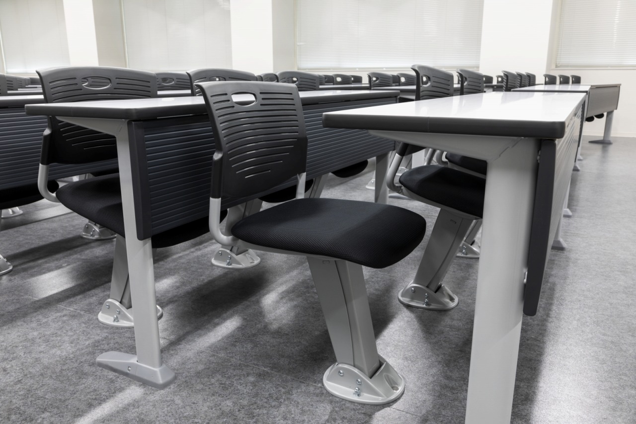 改修を行った0501・0703・0704教室でリニューアル前に使用していたのは、左右の座席が床に固定された支柱に支えられているタイプの固定式の机イスです。支柱を軸にアームがスライドするため、着席したままイスを引くことができ、後ろを通り抜けられるのが特徴でした。20年以上に渡り使用した机イスは、老朽化のため入替えを実施しました。
