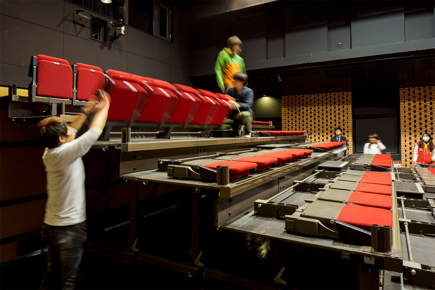 四国学院大学は、「メジャー制度」というユニークな教育システムはを取り入れています。これは、19のメジャー(主専攻領域)と1つのマイナー(副専攻領域)から専攻を選び、自分に合った学びをカスタマイズするもの。その中でも、2011年に「メジャー」として新設された「身体表現と舞台芸術マネジメント」は、中四国初の本格的な演劇コースです。演劇史などの座学や実技の授業を通して、大都市と同等以上の演劇教育を実現しています。 2006年、四国学院大学のキャンパス南側に、ノトススタジオが竣工。コトブキシーティングは、移動観覧席とスタッキングチェアを納入しました。ここではプロや学生たちによる演劇・ダンスの公演が定期的に開催されるほか、全ての席を収納して、基礎練習のためオープンフロアとしても活用されます。四国の高校演劇サミットの会場をはじめとして、地域に開かれたコミュニケーションスペースの役割を果たす劇場です。
