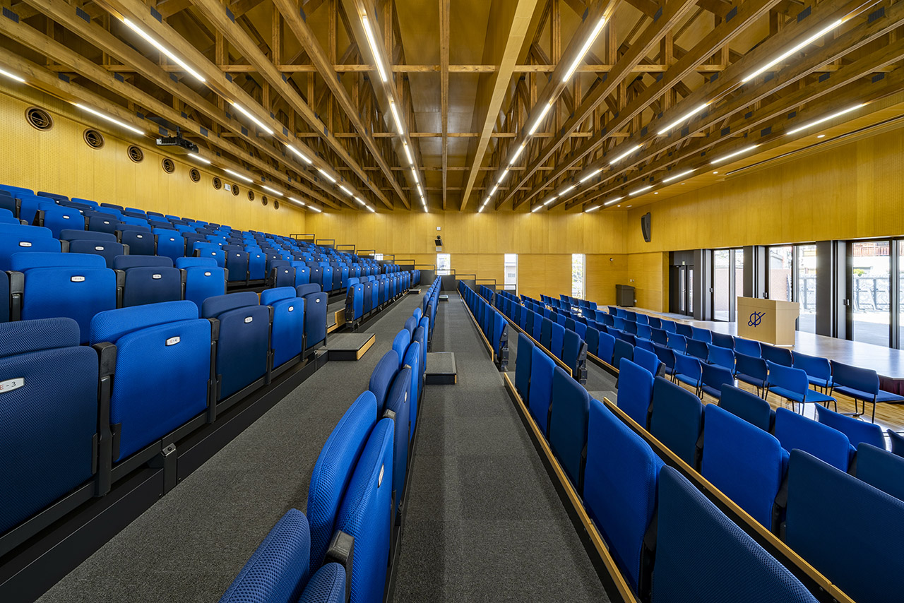 電動式移動観覧席「ロールバックチェアースタンド」とスタッキングチェア、そして移動式のステージが採用されました。388人が収容できる多目的ホールです。
