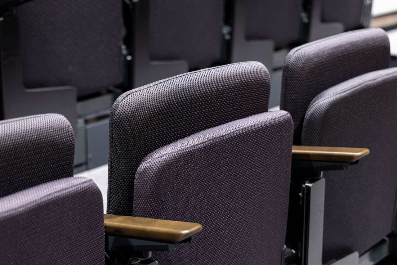 シアターホールの主な用途が、研修や講演会利用であることから、移動観覧席の座席にはメモ台付きのイスが選定されました。イスの張地やメモ台の色は、コトブキシーティングのショールームでイス実物を見ながら検討。内装との調和を考えた落ち着きのある色として、柔らかな印象のグレーが選ばれました。張地は長時間座ってもさらりとした座り心地がつづく、高耐久性立体メッシュです。移動観覧席の前に並ぶのは、背座共に張り包みのスタッキングチェア「