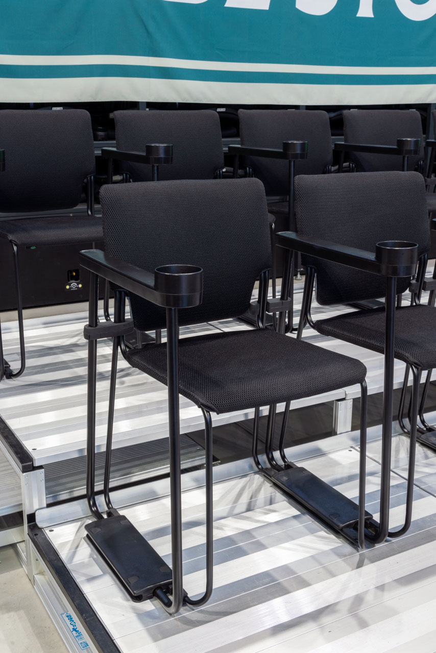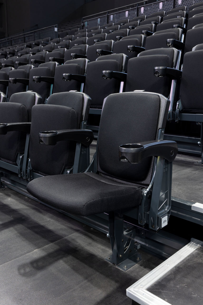 Score」を並べることができます。アルミステージに並べて、アリーナに最も近い位置へ雛壇状の席を設営可能。シンプルな見た目ながらも、腰部まである長い背もたれが、長時間の着席による疲労感を最大限に軽減します。背・座のカバーとカップホルダー付の肘掛は取り外しもでき、「スペックシート」と呼ばれる