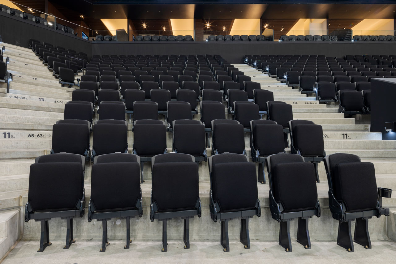 2・3階のメインコンコースは、移動観覧席の最後列から縦通路がひと続きに繋がっています。アリーナシートと共に客席の一体感を高められるよう、移動観覧席搭載イスのVISIONを床固定して設置しました。背座にパッドが備わっており、カップホルダーは背もたれ裏にあります。アリーナのパフォーマンスが見やすいよう、1席ずつやや斜めになった雁行配置も取り入れました。4,313席のうち、北側の52席だけは、イスフレームと脚フレームに分かれた
