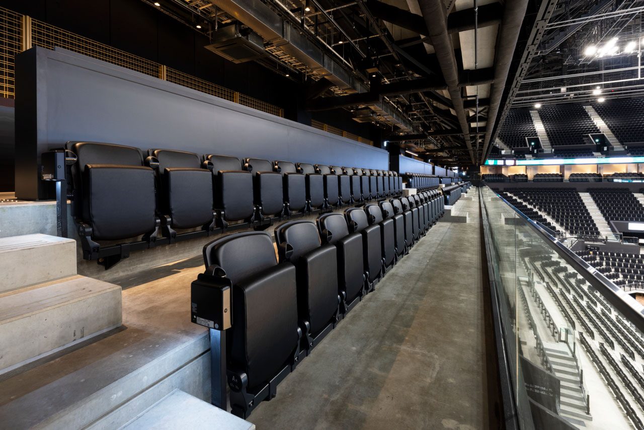 約1万席の観客席は、アリーナをコの字型に囲んで座席が並んでいます。1階のアリーナ席にはスタッキングチェアと展開・収納が可能な移動観覧席が導入されており、2・3階と5~7階は固定のイスが並ぶスタンド席、4階はVIPフロアです。どの席からでも見やすく、アリーナの迫力をダイレクトに感じられるよう、臨場感にこだわって設計されました。色は全席ブラック、空間全体を引き締めながらイベントに集中できる客席をつくり上げています。
