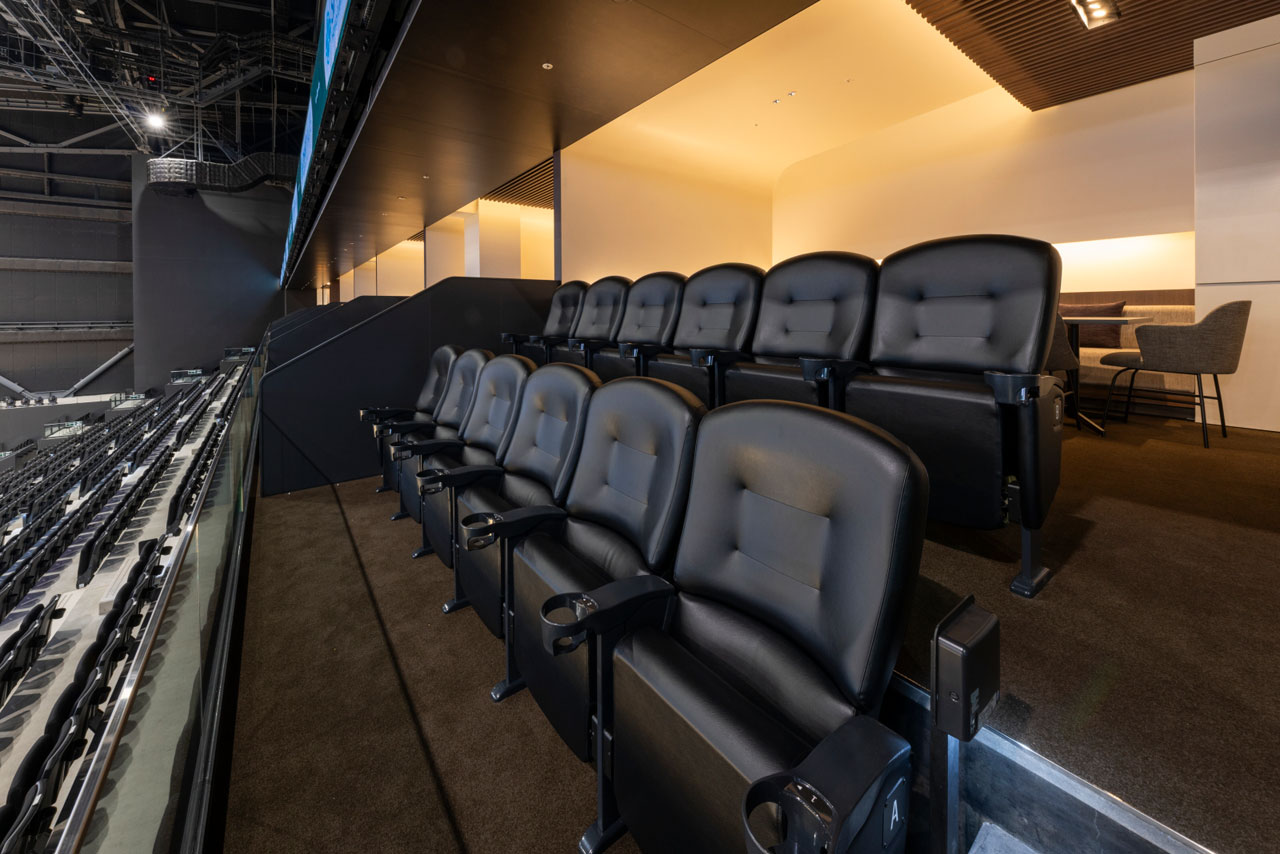 VISION」です。背パッドと座カバーを付けることによって、アリーナに近い席に相応しい、柔らかでゆとりある座り心地をつくり上げました。離席すると座が自動で跳ね上がり、奥行がコンパクトになるため、座席前の通路をスムーズに通り抜けることができます。隣席との仕切りの役割を果たす肘掛には、カップホルダーも備えました。