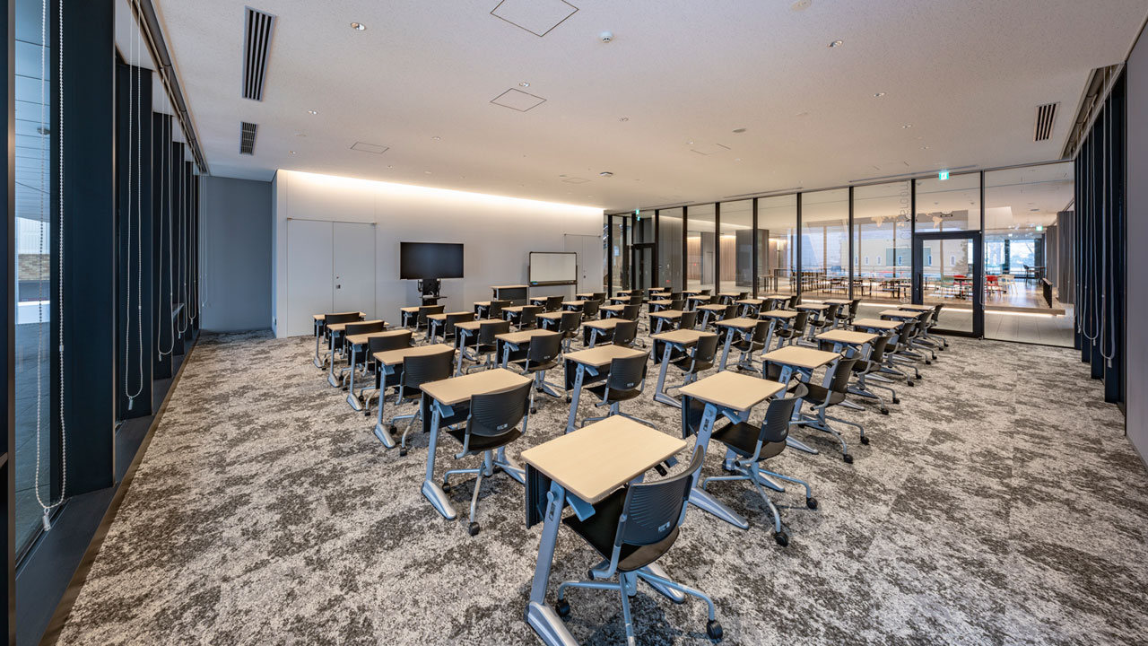 グループでのワークやディスカッションなど、アクティブラーニング型の授業に対応する教室は、2階と3階に複数あり、少人数の授業を前提にしています。30~40席程度ある2階のアクティブラーニング教室は、三方が窓に囲まれており、2階のアトリウムやGlobal Commonsにも隣接されているため、教室の中と外が互いに刺激し合って学びの意欲を深められるようなオープンな雰囲気が特徴です。3階の301・302教室は、パーテーションで仕切ることで各々20~30席程度の教室になり、パーテーションを畳むことで1室最大90人を収容する広い空間にできます。
