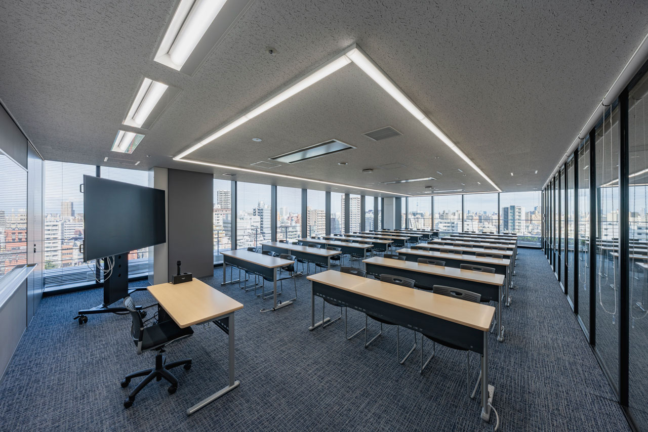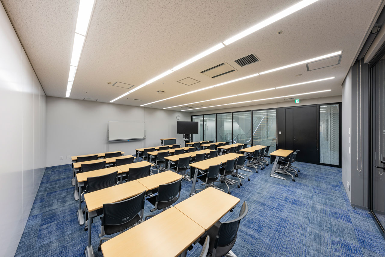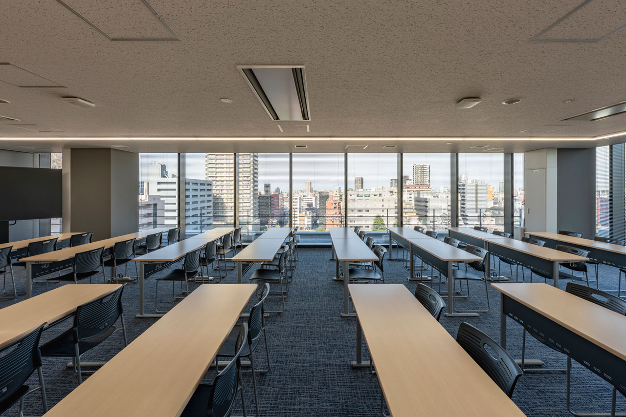 地上22階建ての高層棟には、大人数が一斉に学べる大教室、ゼミや少人数グループに最適な小教室、パソコン対応の移動式教室やアクティブラーニング教室など、学習スタイルや目的に応じた多種多様な教室が並びます。机イスの選定にあたっては、既存キャンパスで実績のあったコトブキシーティングが構えるショールームで、近年の大学事例やトレンドを入念に確認。選ばれた机イスは、どの教室でも木目調の天板の机とブラックを基調にしたイスに統一され、モダンで洗練されたコーディネートに仕上がっています。