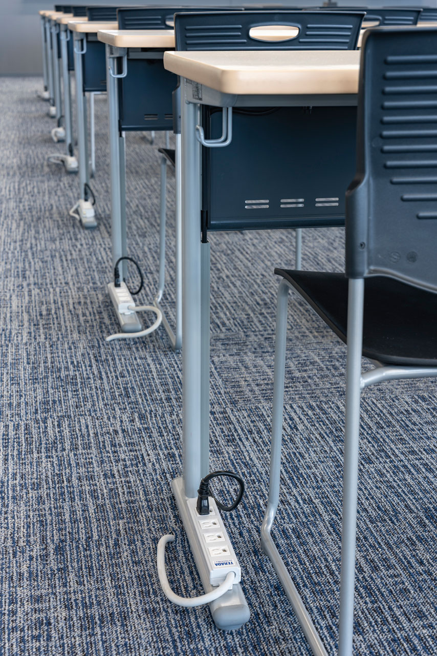 FC-890です。床に向かって垂直に真っ直ぐ伸びるテーブルの脚が、席全体をすっきりとした佇まいに演出。幕板の下部にはリズム感のあるアキがあり、デザインのアクセントになっています。1人掛けの教室が大半ですが、パソコン対応教室のみ、2人または3人掛です。Bring Your Own Device(BYOD)を意識し、移動式の席には珍しいコンセントも天板下に備わっています。床にある電源タップにケーブルを差し込んで接続するため、机を移動させてレイアウトを変えても、電子機器の使用が可能です。スタッキングチェアのFC-890はコンパクトな寸法で軽量、背もたれに手掛け穴もあるため、持ち運びがスムーズ。背当たりと背座角度が広いため、座り心地はゆったりと深く快適です。
