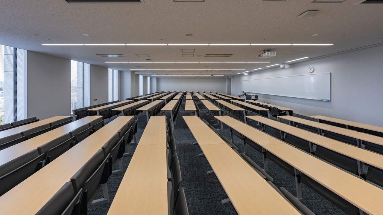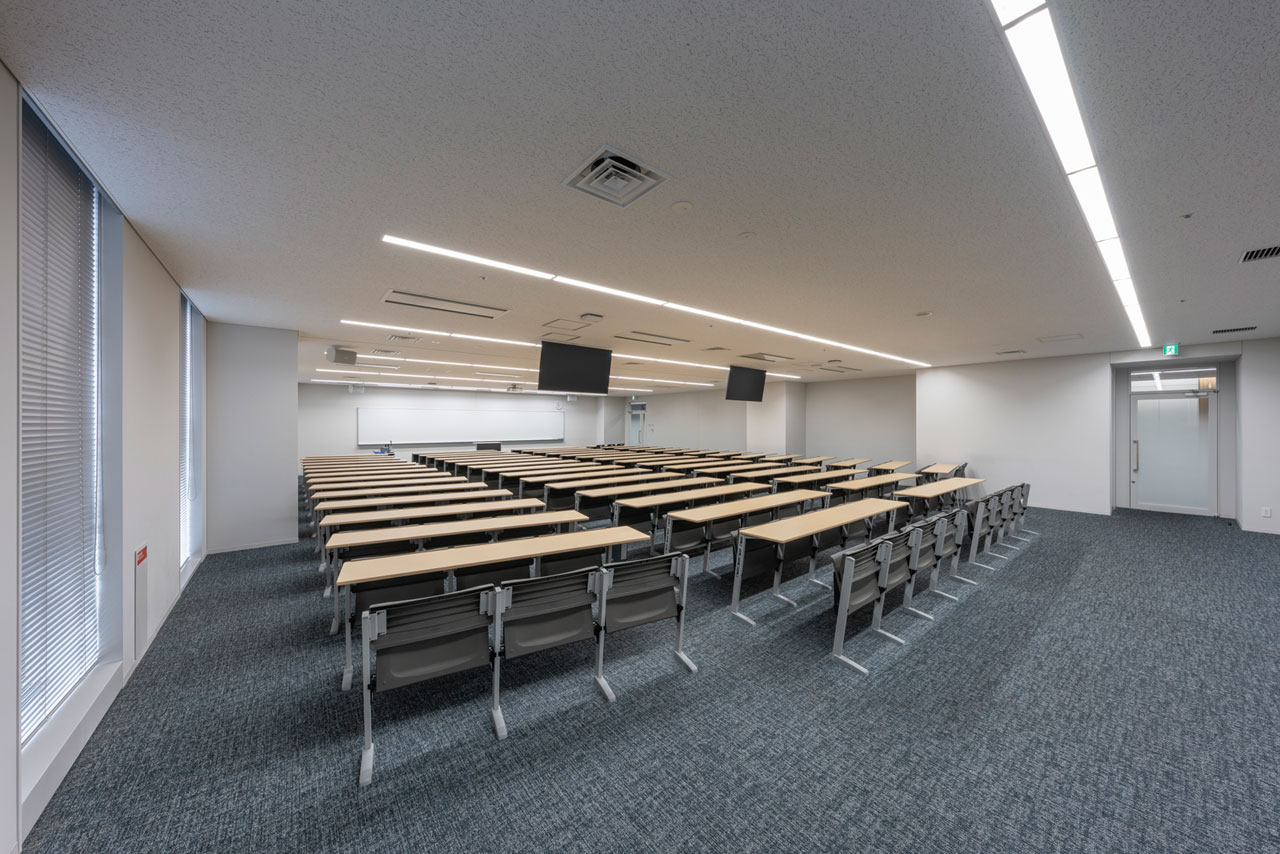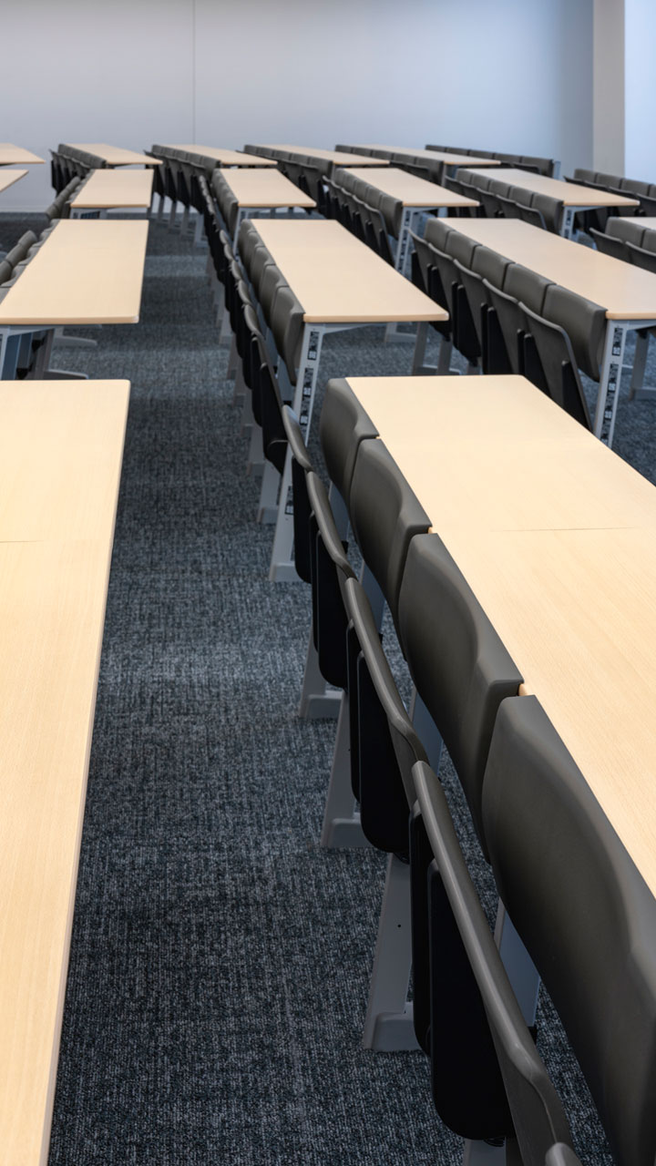大人数が一斉に講義を受けられる場所として用意されたのは、100席前後の中規模教室と、200席程度の大規模教室です。選ばれた机イスは、既存キャンパスでも実績があった、床固定式の