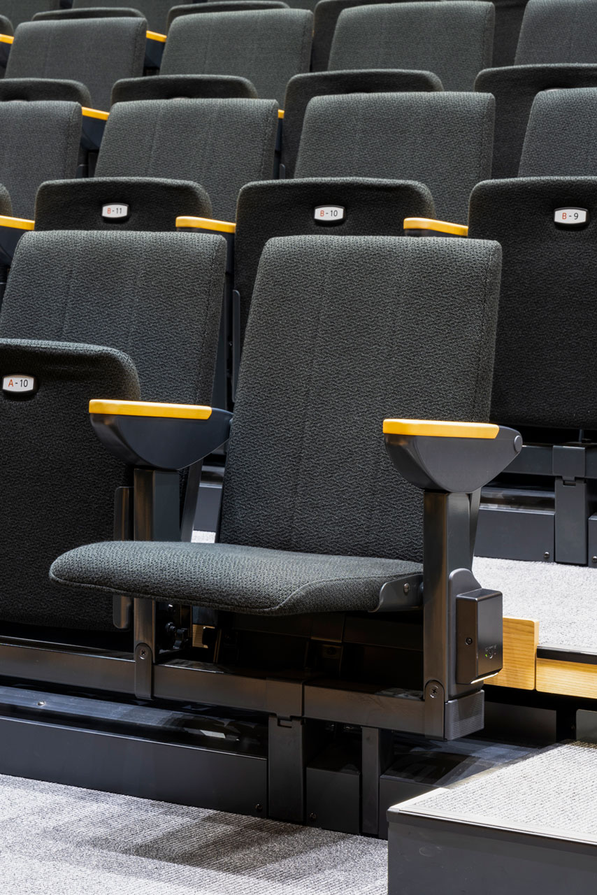 いずれの座席もブラックの張地で統一されており、木目を生かした温かみのあるホール空間に、落ち着きと一体感をもたらしています。