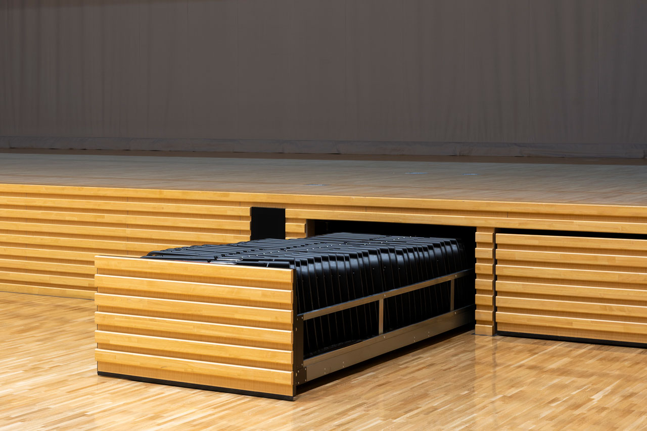 収納時には、上段の手摺を取り外し、1段目のステップを折りたたむだけで準備が完了。あとは収納スイッチを押すだけで自動的に壁の中へと収納されるため、少人数の施設スタッフでも素早く空間を切り替えることができます。フォールディングチェアは台車ごとステージ下に収納可能で、すべてを収納すればホールを平土間として、展示会やダンスなどに活用することができます。