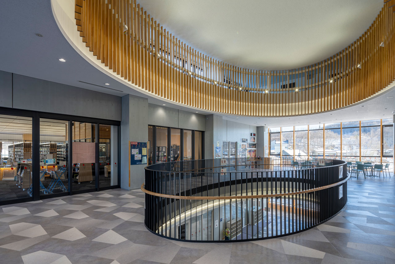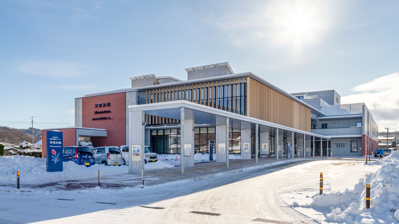 2023年12月、岩手県軽米町に、かるまい文化交流センター「宇漢米館」がオープンしました。中央公民館と図書館の建て替えを機に、バスターミナルや子育て支援施設、トレーニングルームなどを併設して開館した、地域の新たな交流拠点です。外観を印象づけるのは、町の特産であった赤レンガ。ガラスを多用した開放的な設計により、外から施設内の賑わいも感じられます。