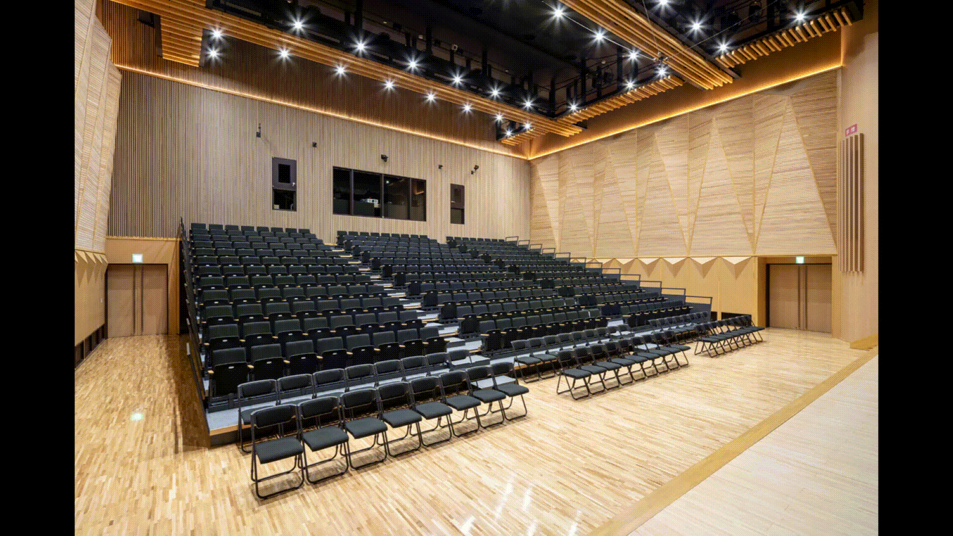 多目的ホールは、300席の移動観覧席と100席のフォールディングチェアを組み合わせることで、最大400席まで対応できるフレキシブルな空間です。