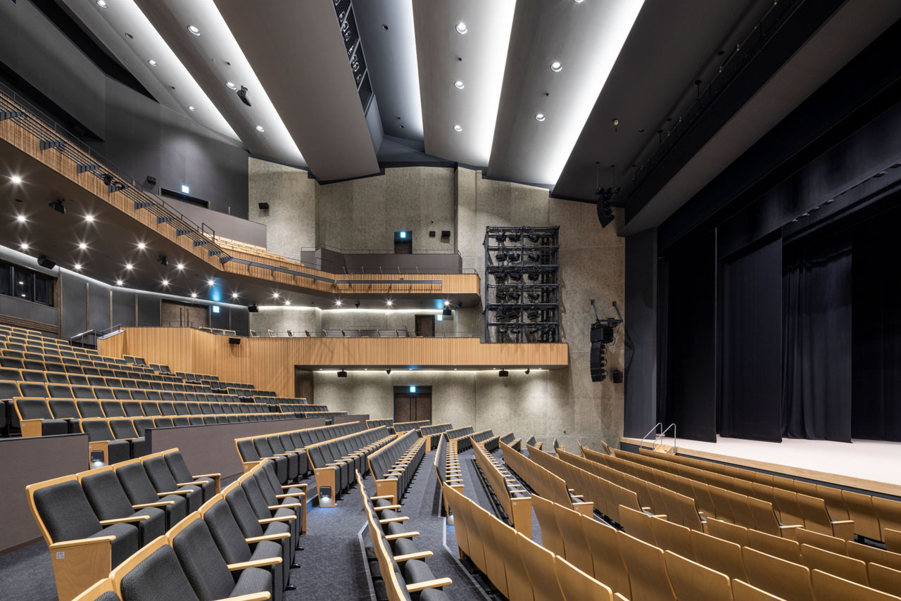 座席は直線状に並んでおり、バルコニー席を含む2階席は舞台と1階席を囲むような多角形配置です。1階席中央の横通路から後ろの席と2階席には、階段状にしっかりと勾配をつけることで、舞台から各席までの距離を近づけました。見やすさにもこだわり、1階席の前半分と2階席中央ブロックには、前後で半分ずつ座席の位置をずらす千鳥配置を取り入れています。