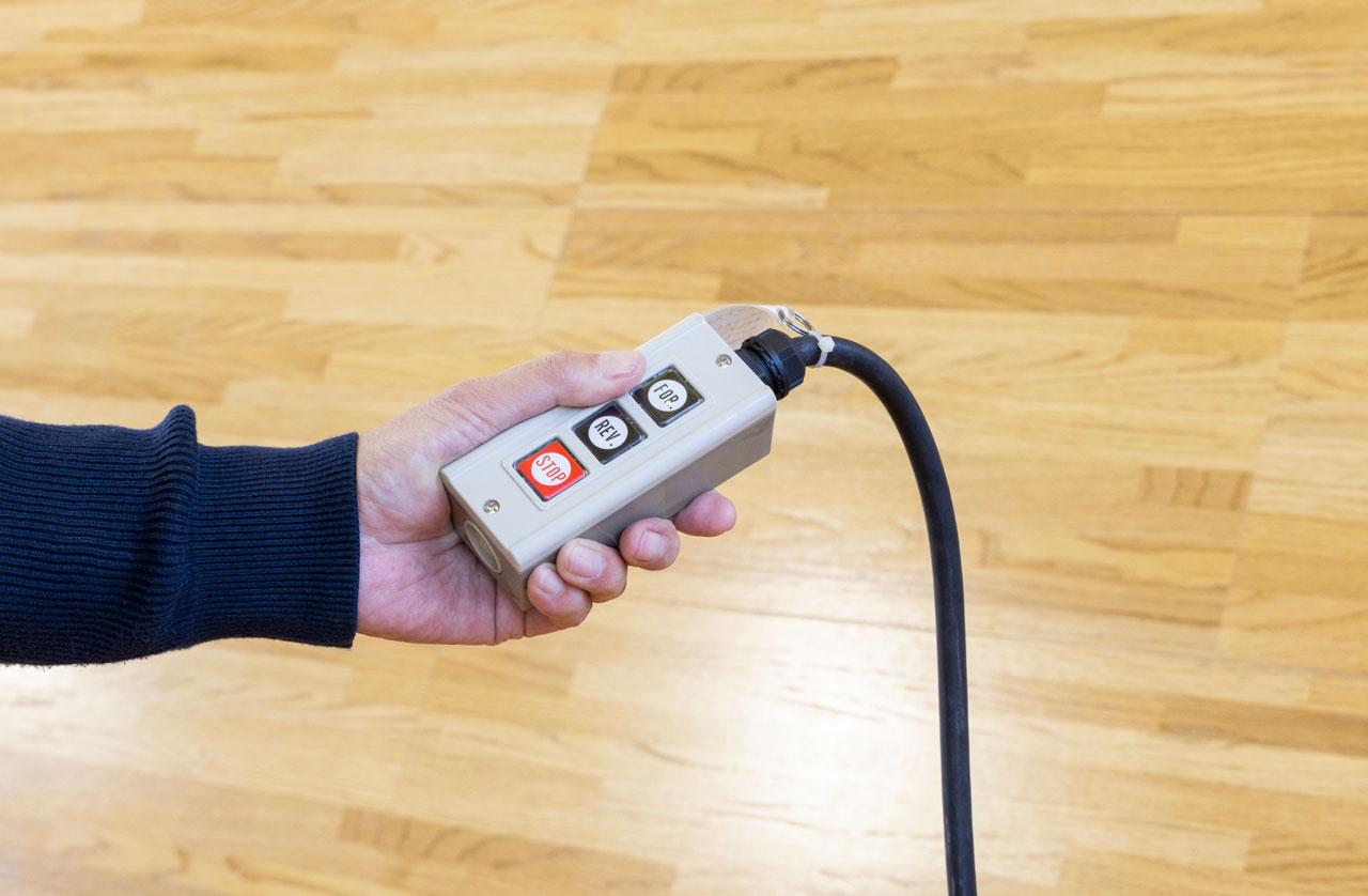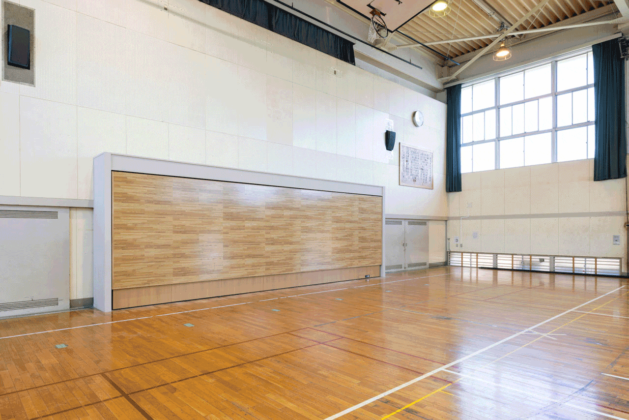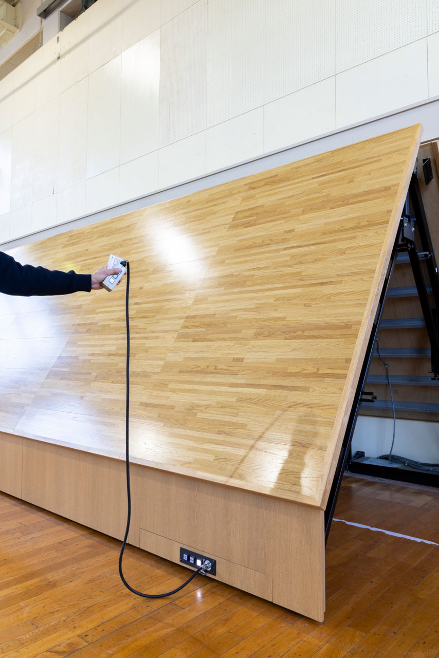 収納状態からステージが展開するまでは、わずか約5分。リモコンによる電動操作で簡単に設営・収納ができ、教職員の負担が大幅に軽減されます。ステージは壁面収納式のため、体育の授業や運動部の活動では、広い空間が確保でき、生徒が伸び伸びと活動できます。