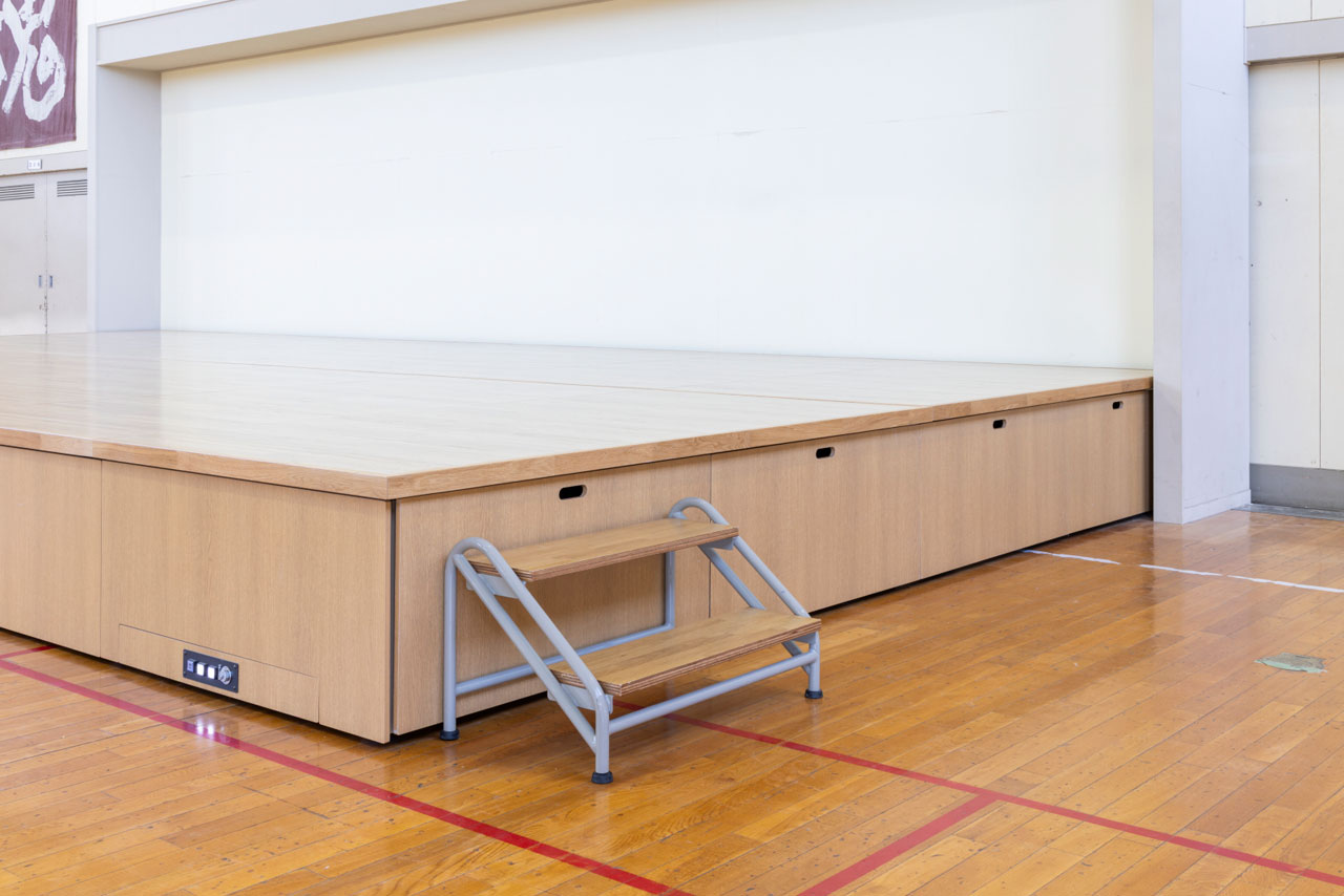 新しいステージは、入学式などの式典はもちろん、吹奏楽部のコンサートや生徒会行事などに活用されています。従来の移動式タイプに比べ、ステージの設営が手軽になったことで、スポーツの場から式典・発表の場への切り替えが柔軟になり、生徒の活動の幅が広がったと好評です。