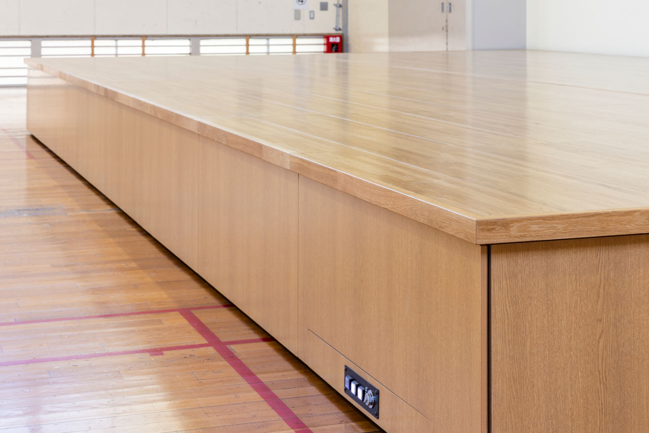 これにより、本格的な大型ステージを導入しながらも、備品の出し入れといった日常業務の動線を妨げることなく、限られたスペースでの効率的な運用を実現しています。