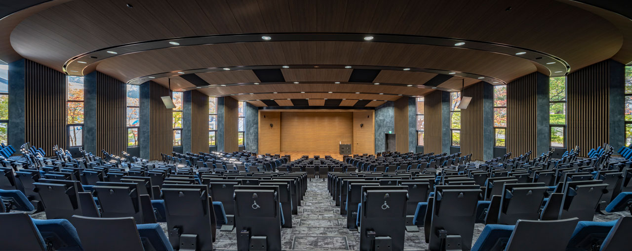 同志社大学京田辺キャンパスは、1986年に関西文化学術研究都市の一角に開校。総面積約79万㎡の広大な敷地には、理系学部を中心に約9,000人の学生が集い、最先端の実験・情 報設備が整備されています。教室棟「恵道館」は、講義に加えて講演会や学会にも対応す る多機能施設で、その名称は「道を恵める、恵みの道」に由来します。今回のリニューアルでは、新たに最新型スクリーンや自動追尾システムも導入され、プレゼンテーションをよりリアルに可視化できる環境が整いました。新たな知の拠点として生まれ変わったレクチャーシアターが、これからの多彩な教育・研究活動を支えます。