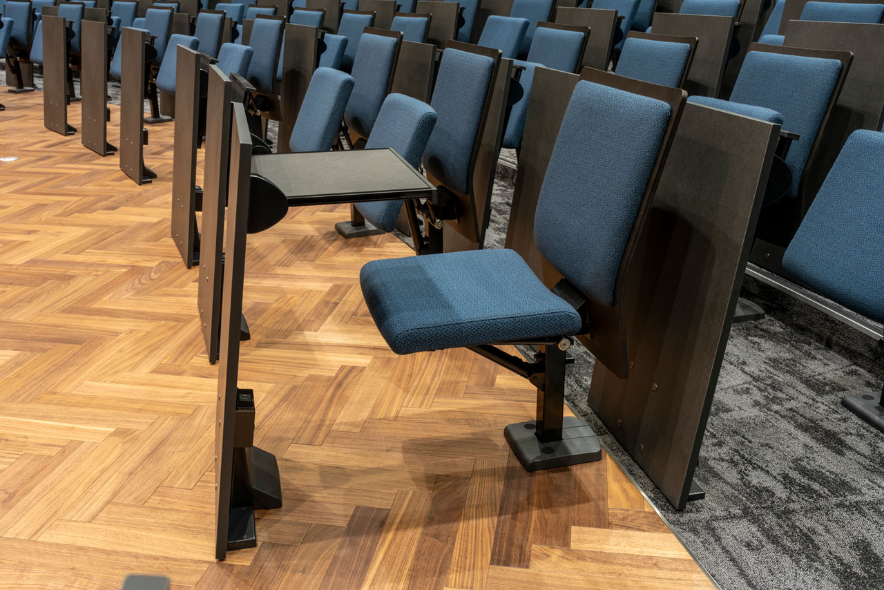 LT-330」は、本講義室で長く親しまれてきた座の「スイングアップ機構」が継承されています。身体の動きに合わせて座面がスイングアップするこの機構は、利用者の立ち座りのしやすさ、離席時の通路幅を広く確保できることが特長です。くの字形の背板に立体的なクッションを備え、三層構造ウレタンの座面によって、長時間の着座でも快適な座り心地を維持します。