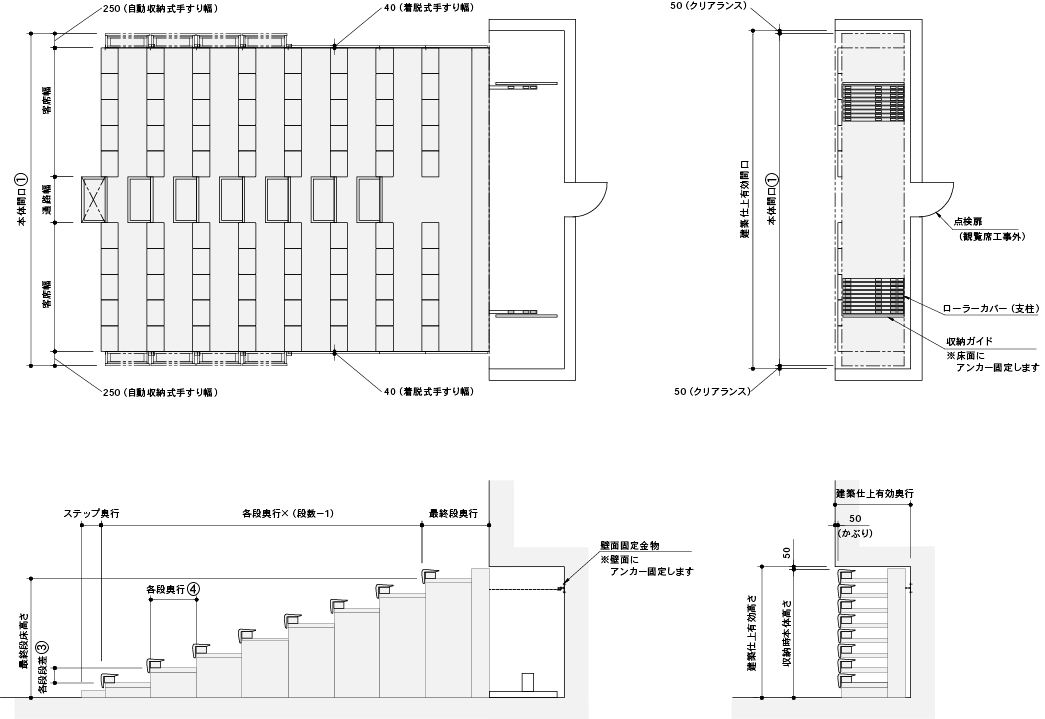 リフター台車を使用し、リフトアップ(約55mm上昇)させて移動します。収納庫及び収納庫までの移動経路上の建築仕上有効高さ(本体+リフトアップ高さ以上)を確保願います。