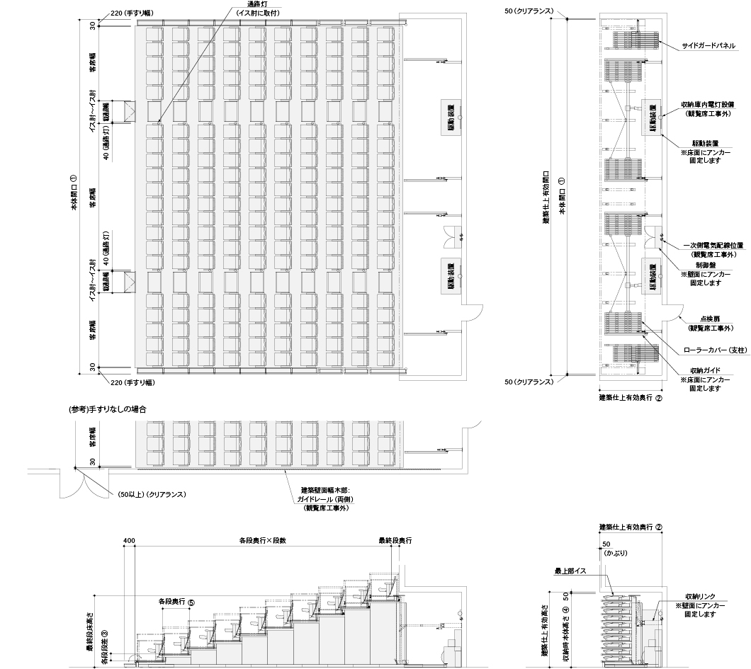 段数・段差は、建物との関係あるいは必要な総席数から決定します。
