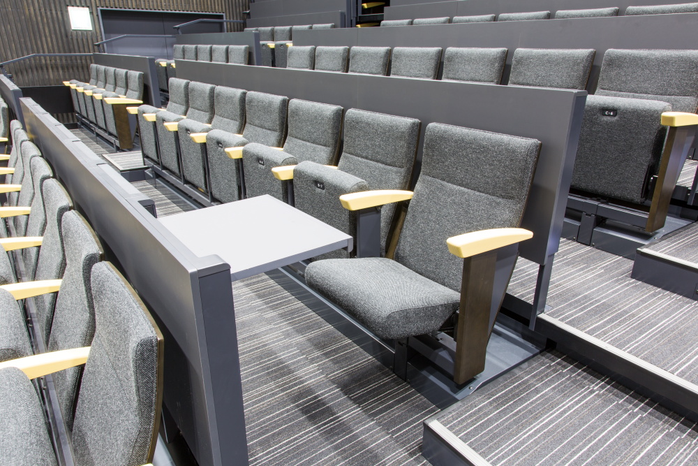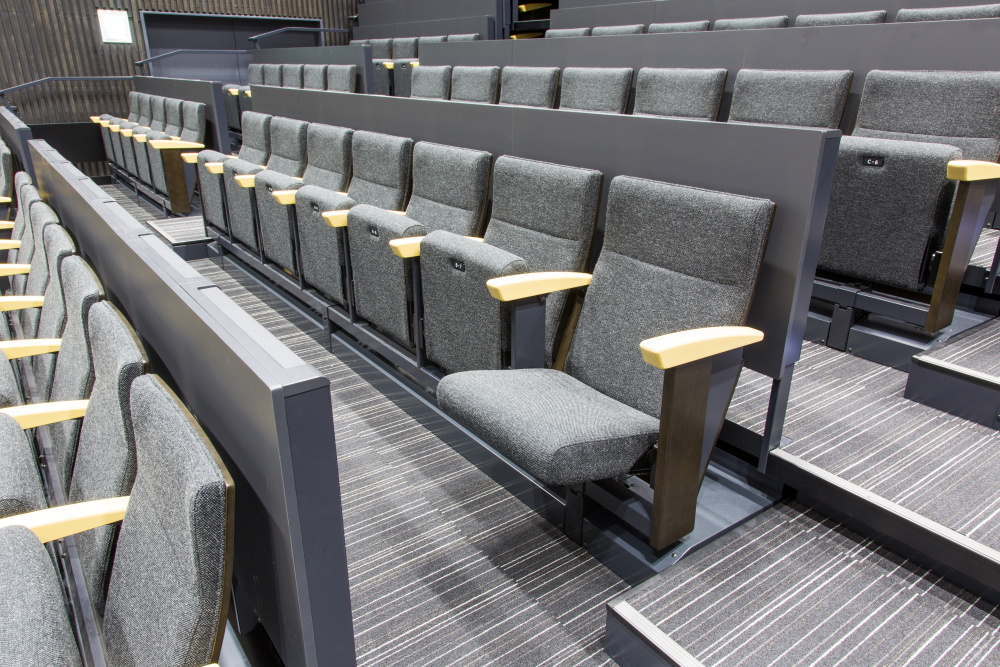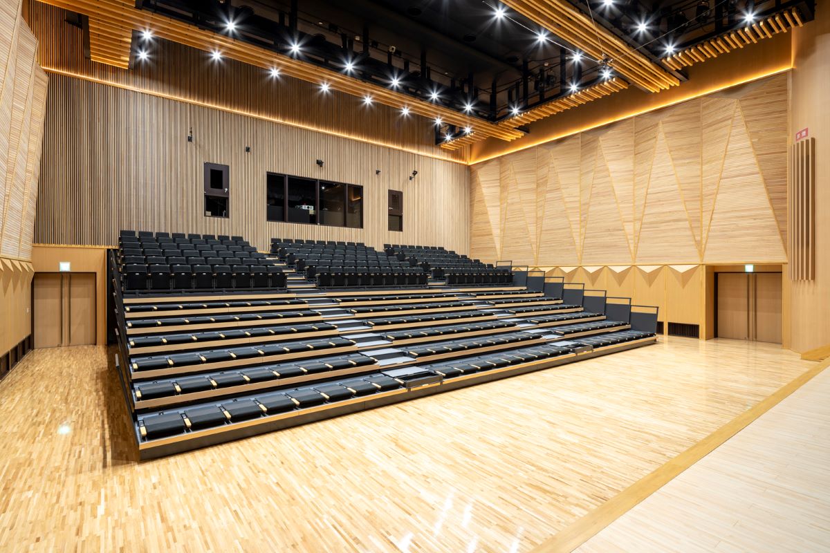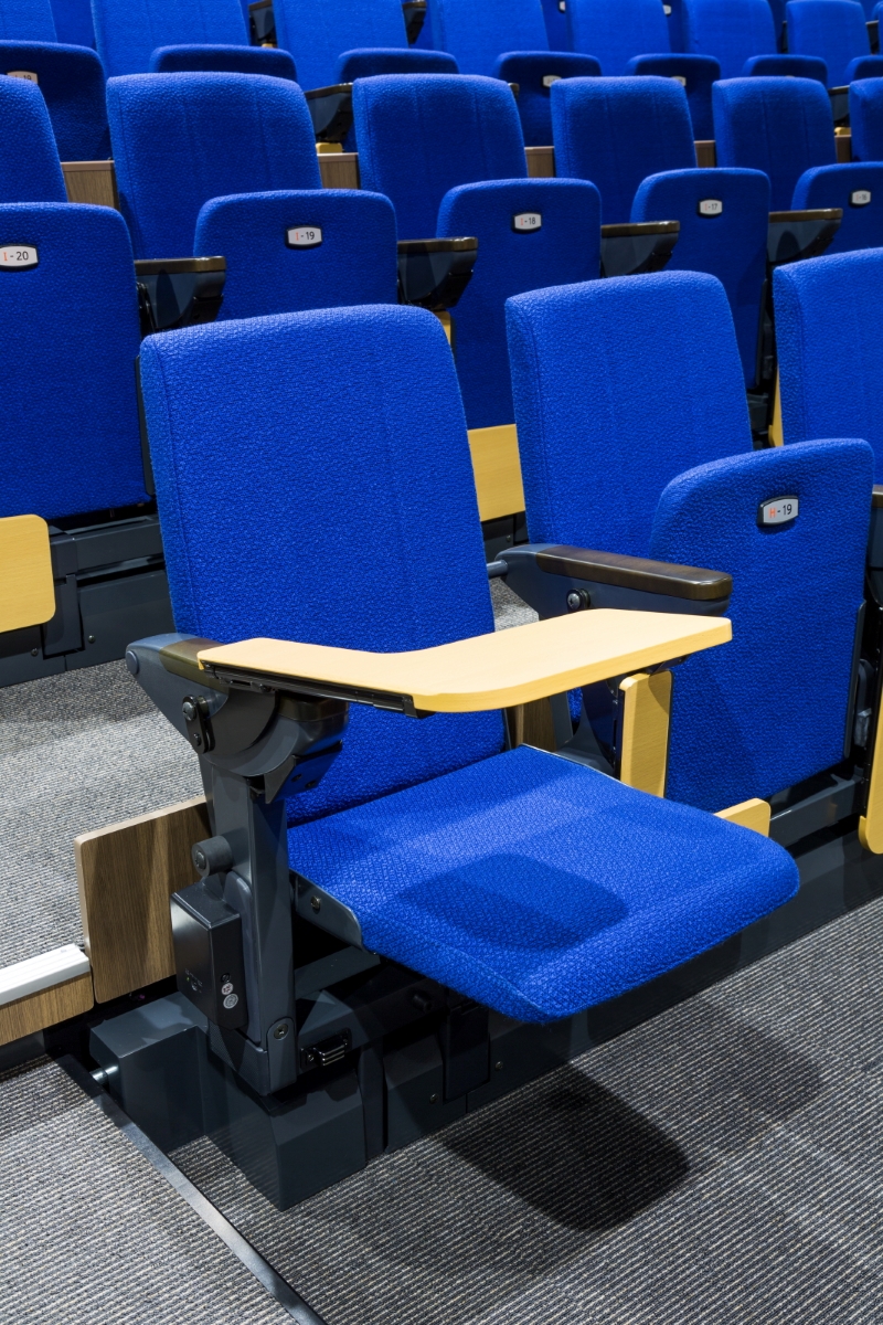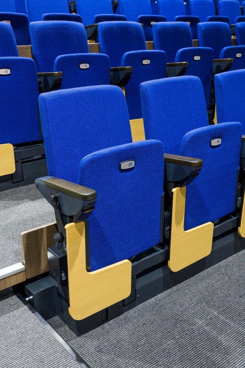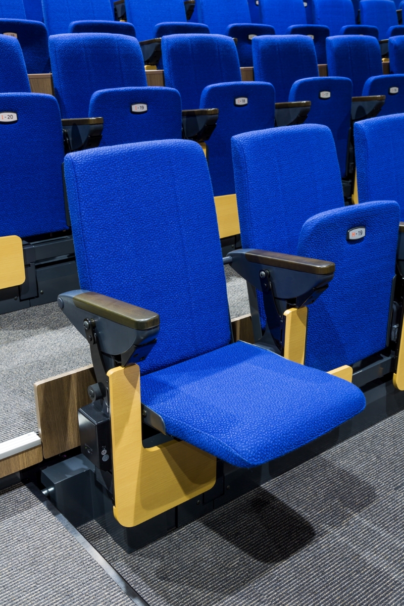 移動観覧席でありながら、新基準を設けた開発により、固定式の劇場イスと同様の「品質」と「快適性」を装備しました。時代が求めるコミュニケーションの広がりと進化へ向けて、これまでに育まれてきた劇場の格調をそのままに、新時代を見つめた空間活用を実現。進化した可変劇場イスにより、これまでの固定席で構成されていた本格的なホールの多目的な活用を可能としました。上品で格調高い空間を生み出す、最新の技術が詰まった劇場イスです。