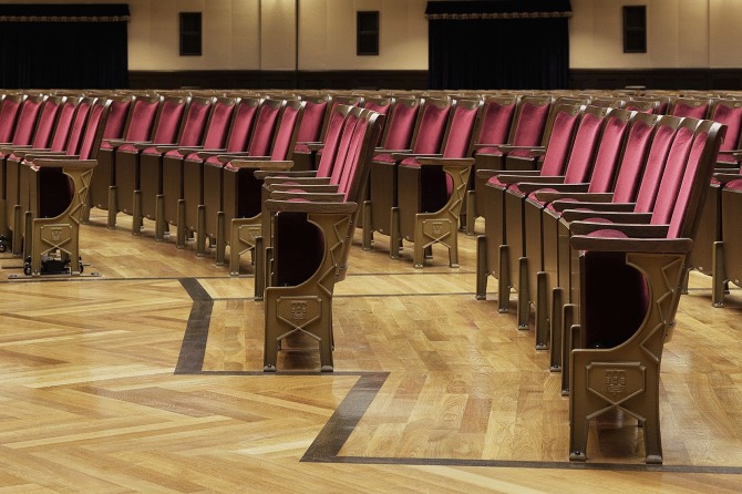 コトブキシーティングは、1924年の帝国劇場約1,700席の製作参加を経て、1925年には東京帝国大学(現・東京大学)の安田講堂のイス製作に着手しました。安田講堂では、度々の改修を重ねながらも、イスは納入当時のデザインを踏襲しています。