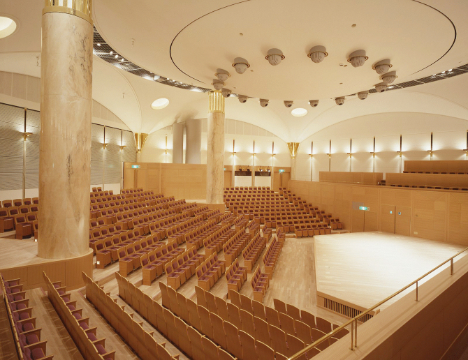 ギャラリーから廊下を隔てた位置にあるのが、コンサートホールATMです。ホールへの扉を開けるなり、思わずハッと息を呑むほどの華やかで美しい空間です。ホール内で大きな存在感を放つのは、大理石の大きな柱。ポルトガル産のローズオーロラと呼ばれる石で覆われています。この柱が、直径13メートルの音響反射盤を持つ円形の天井を支えているのです。