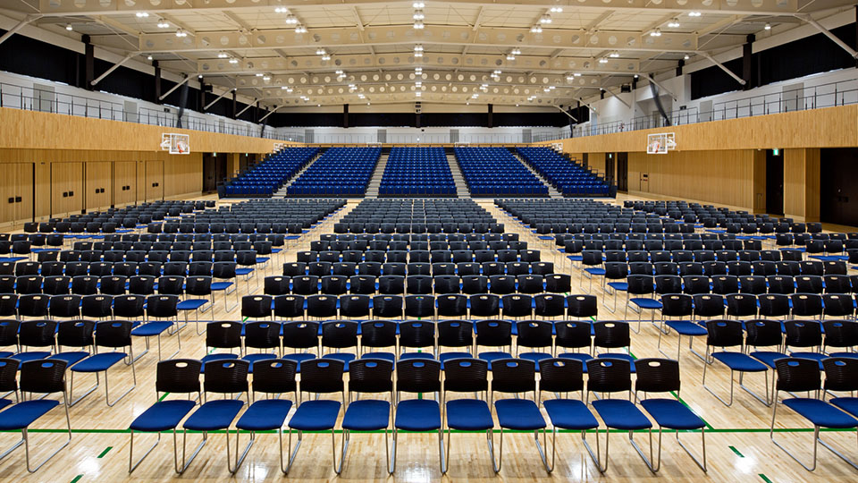 スタッキングチェアと移動観覧席を収納すれば、この本格的な講堂を、屋内運動施設として利用することが可能です。電動式防球ネットを設け、ボールなどによる固定席の破損を気にすることなく、スポーツに励むことができる環境を整えました。座り心地と多目的活用を兼ね備えたスペースです。