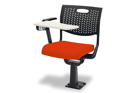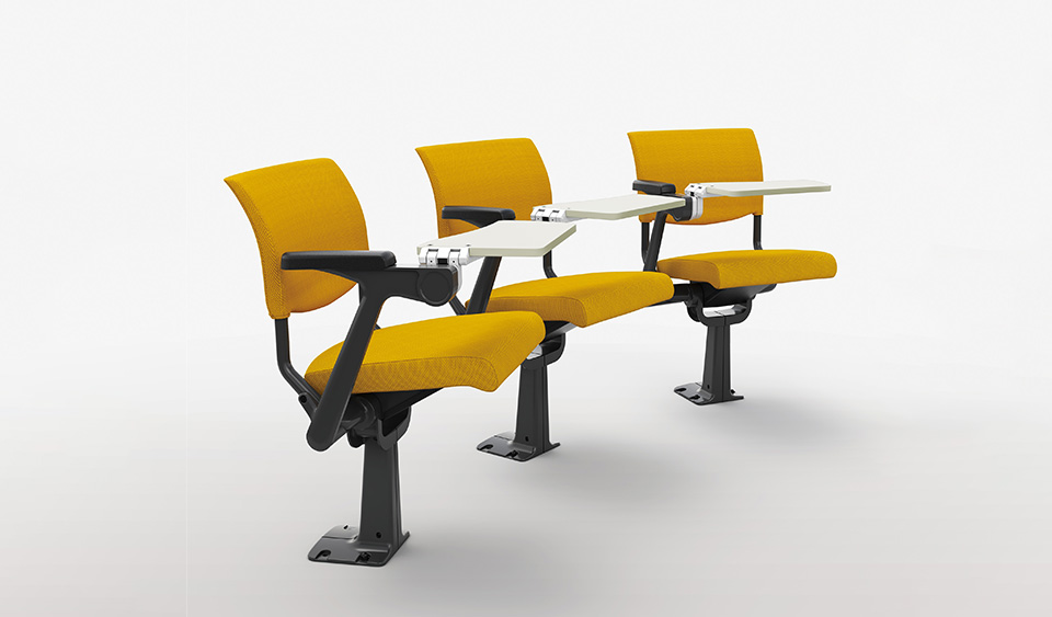 学生向けの通常の講義用の固定机イスとは異なる、上品さと高級感を演出。クッションのボリュームや肘掛や背裏・座裏にふんだんに使われた天然木は、外部からの来訪があるセミナーや外部講師を招いての講演会、学会等の会場にも適しています。劇場・ホールのような非日常の空間演出をしながらも、学習の場には欠かせない安定感のある机を備えた製品です。
